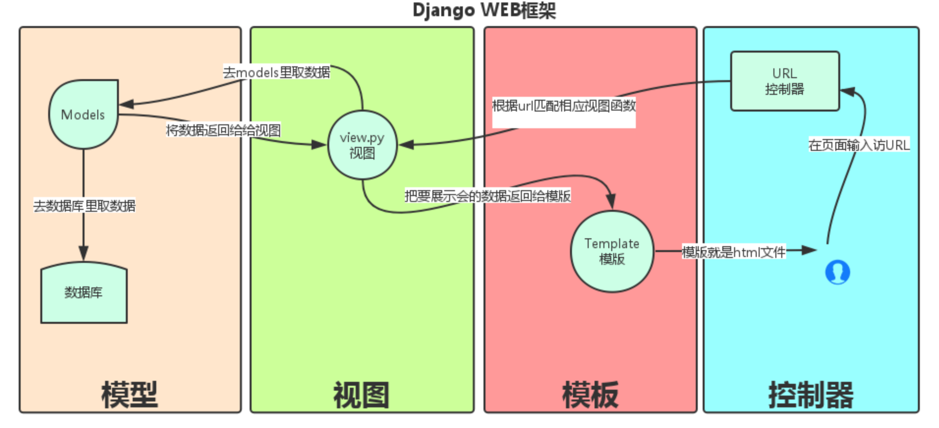 除了以上三层之外,还需要一个URL分发器,它的作用是将一个个URL的页面请求分发给不同的View处理,View再调用相应的Model和Template,MTV的响应模式如下所示:
